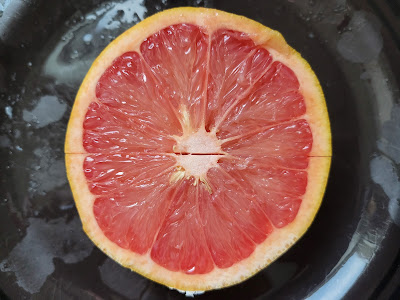 étalées de confiture à la mûre et une demi-pamplemousse rose,